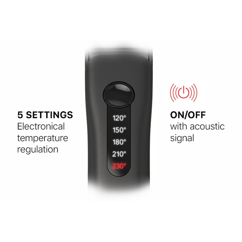 Электронная система регулировки температуры нагрева обеспечивает максимальную гибкость и универсальность в использовании выпрямителя с волосами различного типа. Пользователю доступно 5 режимов нагрева: 120, 150, 180, 210 и 230 C. Для выбранного режима на внутренней части корпуса реализован отдельный LED индикатор для удобного визуального контроля. Магазин valera-professional.com.ua может рекомендовать данную модель, как для работы, так и для домашнего использования – выпрямитель подойдет для работы на любых волосах.